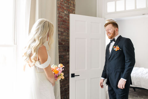 Kait decided to get ready at an AirBnB, a choice that added an extra layer of intimacy to the day and created a stunning backdrop for photos. The ladies enjoyed a leisurely morning of hair and makeup by the experts at Le Rêve Makeup & Hair. In the bedroom window hung Kait's gown from Lovely Bride Cincinnati, a Tara Lauren design with a removable train that captured her unique style. Her attire was accented perfectly by bridesmaid gowns in a dawn blue by Revelry